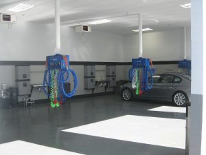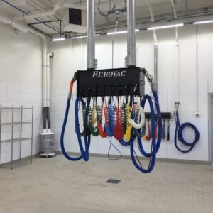 - 25’ Coiled Line & Air Blow Gun for blowing out particulate from hard to reach areas inside a car. Eurovac supplies a 15’ airline for running from the pendant drop up to the beams. Typically customer connects from this 15’ airline to the central air hard piping which is connected to a centrally located compressor system.